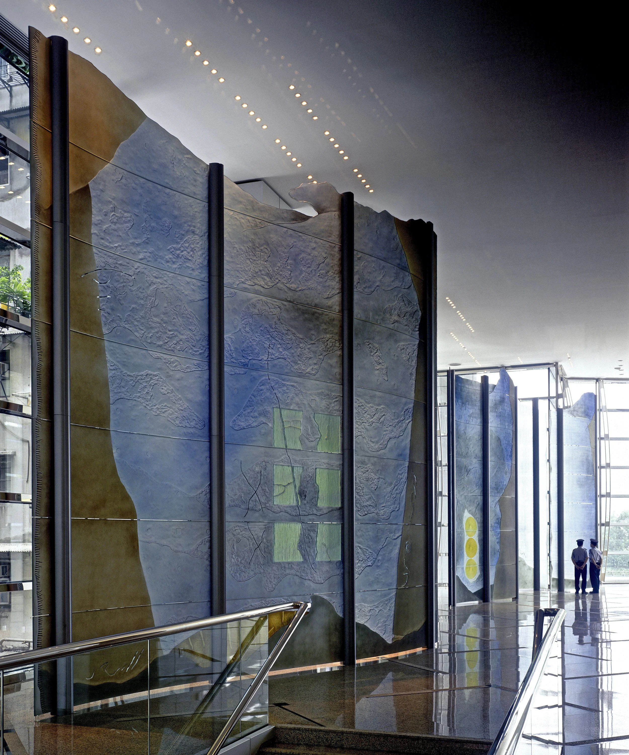 Sea of time, Lincoln House, Part 2 Chronos Trilogy, Hong Kong, China, Carved glass sculptures in Lincoln House office tower. 100' x 27'