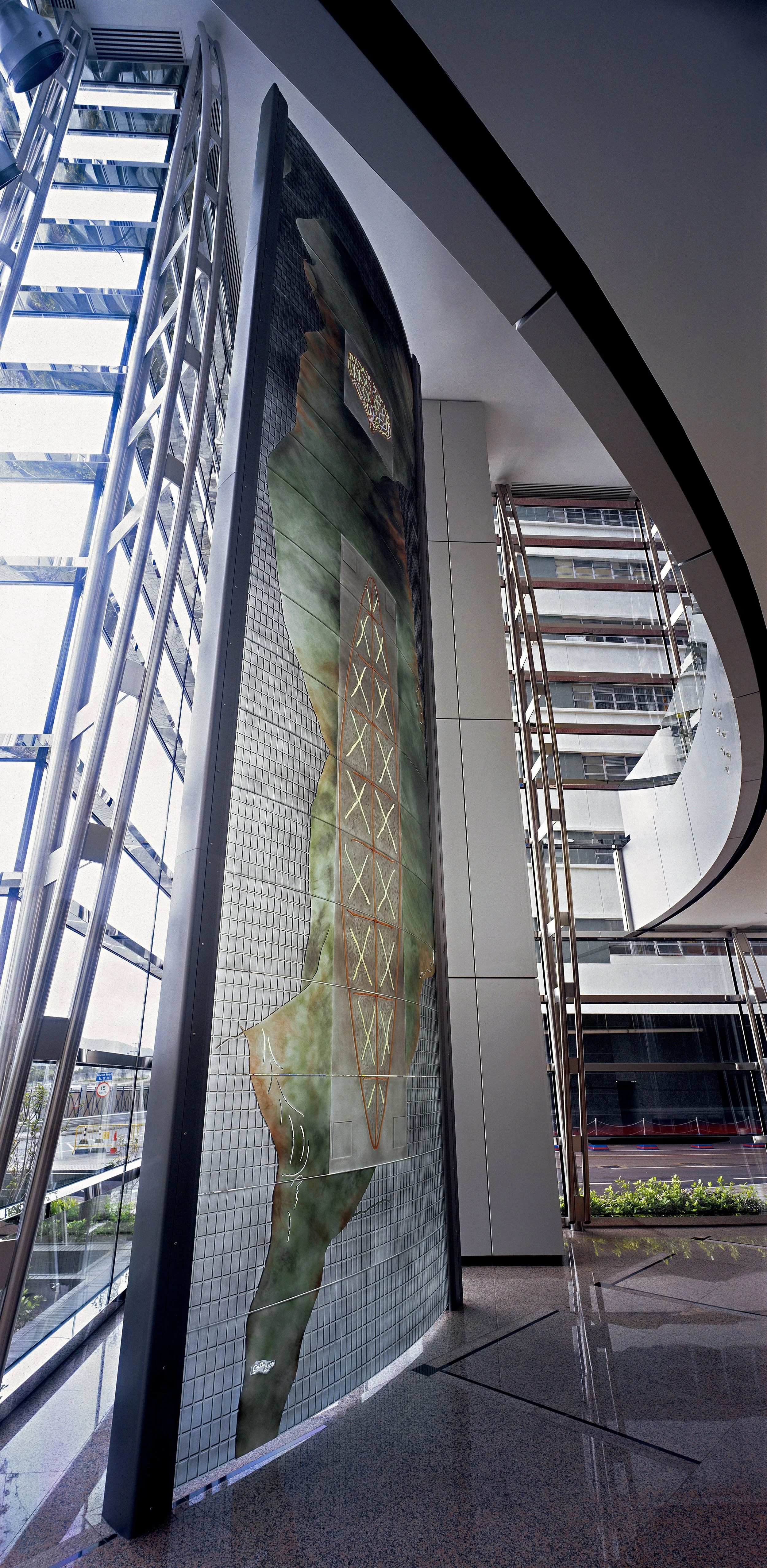 Vestige, Lincoln House, Part 1 Chronos Trilogy, Hong Kong, China, Carved glass sculptures in Lincoln House office tower. 27' x 16'